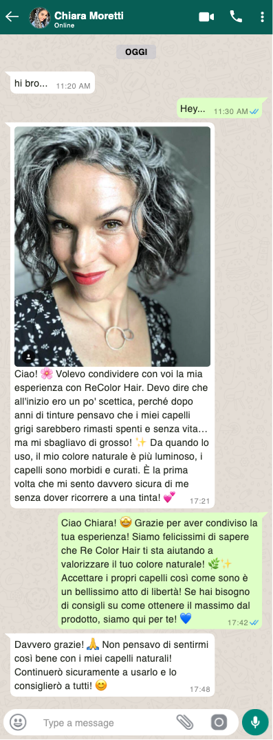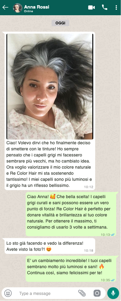 Non pensavo che uno shampoo potesse migliorare così tanto l'aspetto dei capelli grigi! Re Color Hair ha ravvivato il mio colore naturale, donandomi una chioma più luminosa e sana. Mai più senza!