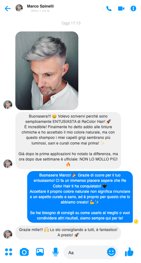 Re Color Hair è un vero alleato per chi ha capelli grigi o bianchi! Nutre, idrata e illumina la chioma senza aggredire il cuoio capelluto. Dopo poche settimane di utilizzo, i miei capelli sono più morbidi e lucenti come non lo erano da anni!